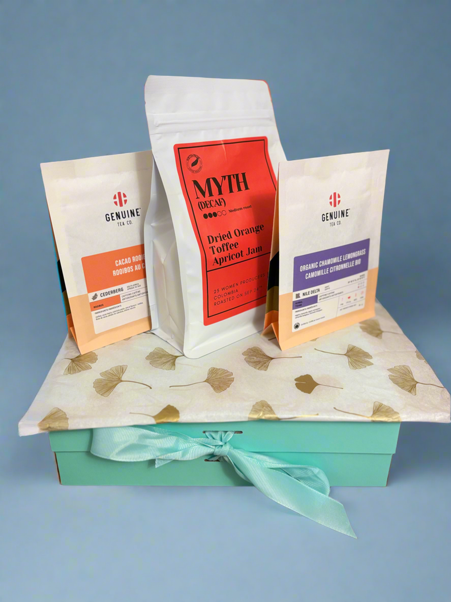 Created for rest, reflection, and balance. Decaf Myth anchors this calming box with a full-bodied yet caffeine-free cup. Paired with Organic Chamomile Lemongrass and Cacao Rooibos herbal teas, the collection is pure tranquility in a box. A soothing choice for someone special—or for yourself—when you need to press pause and breathe.